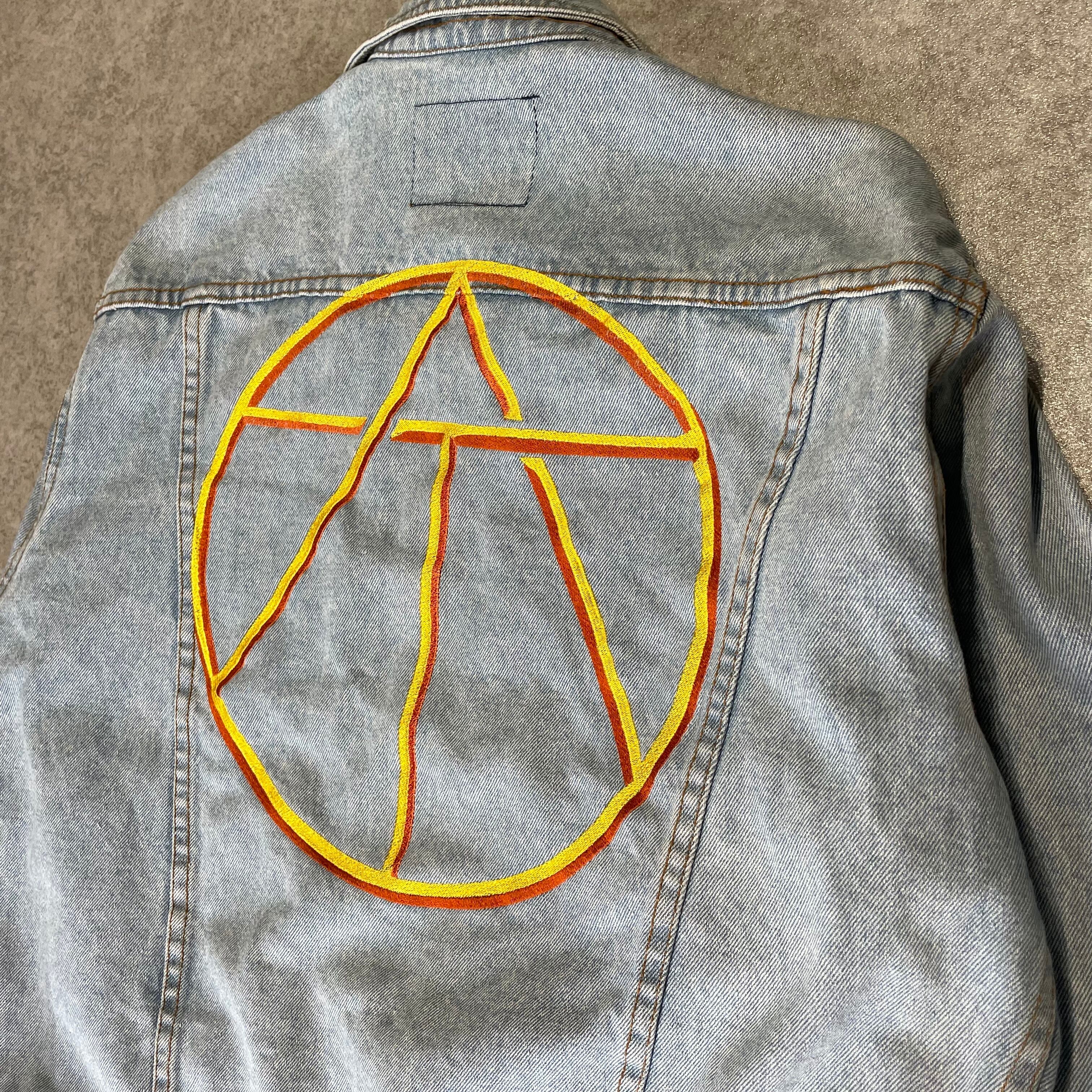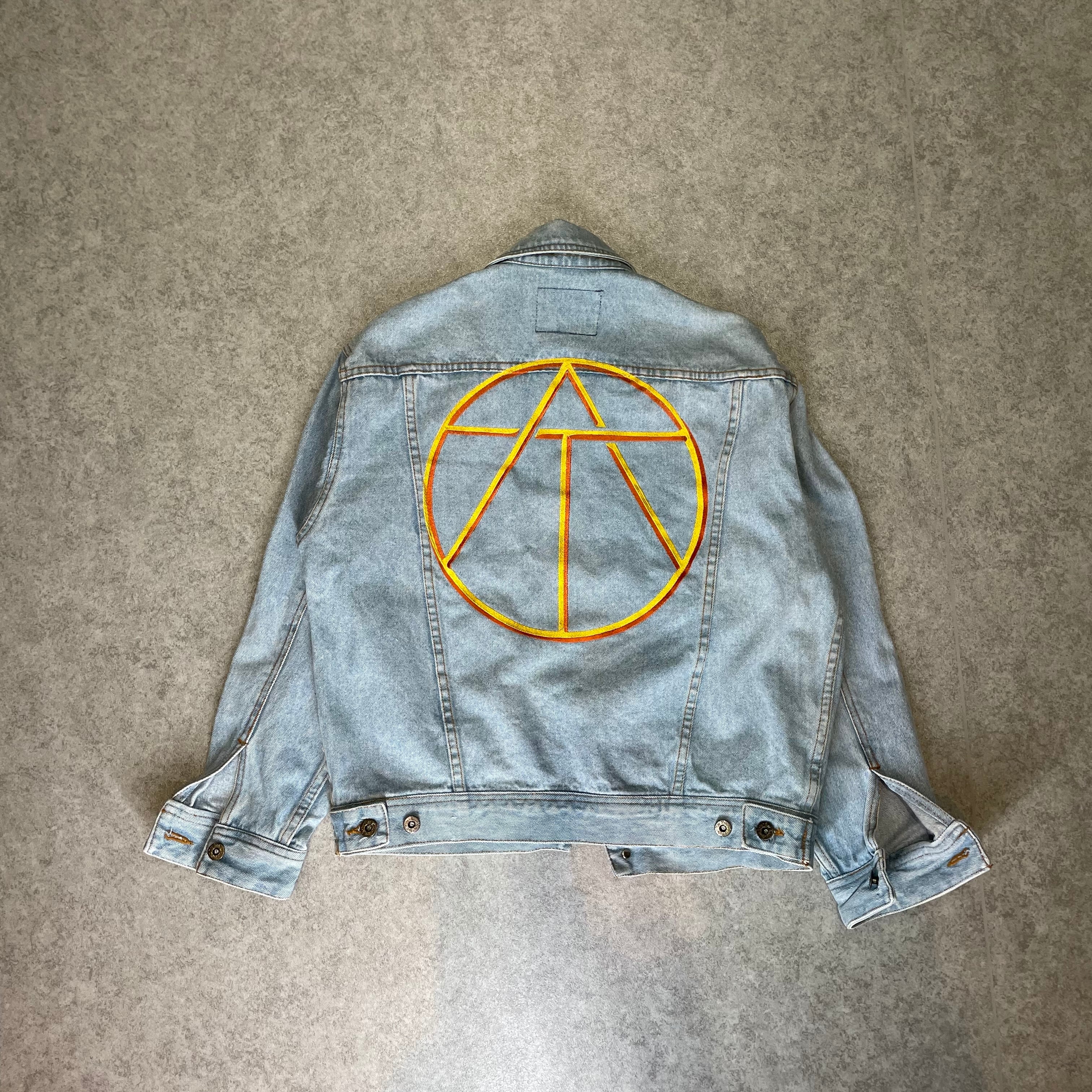 商品名:Emblem logo denim jacket 着丈約60cm 肩幅約45cm 身幅約55cm 袖丈約55cm ※こちらの商品は90’s usedジャケットに刺繍を施した一点ものになります。